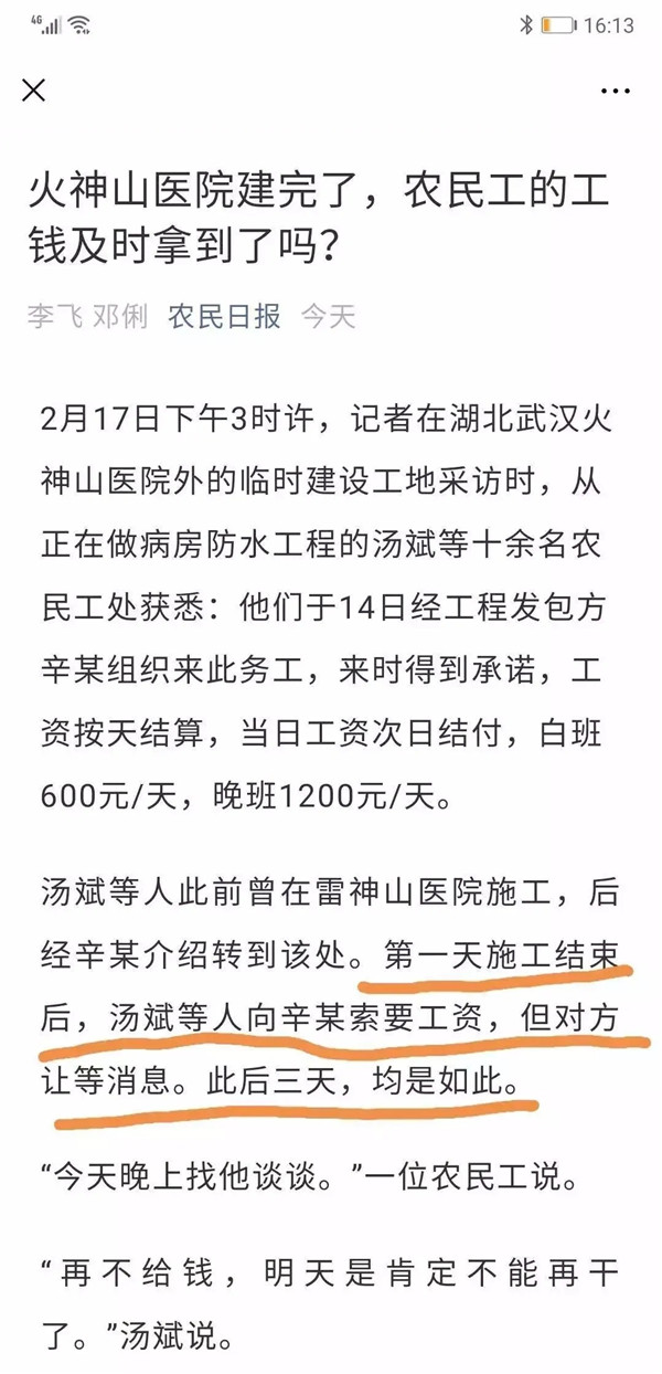 这次特殊时期,建设火神山,我愿意相信建筑方是不会克扣农民工工资的。报道出来的第二天,农民工的辛苦钱就已经到手了。而且,从报道来看,给的工资也比平时要高一些,彰显了充分的人为关怀。
