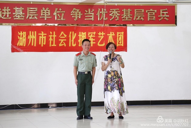 2017年7月16日下午湖州市社会化拥军艺术团在团长李根娣、副团长胡金锦、艺术总监李利民老师带领下全体艺术团成员顶着烈日冒着38度的高温前往湖郊武警部队教导队进行首场慰问演出。本次演出得到了总工会副主席张显东、市广电总局纪委书记汪东海、工商联副主席吴静、前女企业家主席梦圆集团董事长胡国萍等领导的高度重视并一同前往部队进行慰问,受到了武警部队教导队长高敬轩和全体官兵的热烈欢迎。本次慰问演出是艺术团成立一个月后的首场演出,由艺术总监李利民老师客串主持节目,节目内容丰富多彩,独唱合唱表演唱、独舞合舞集体舞,特别是艺术团与武警部队官兵互动齐唱跳舞联欢把活动推向高潮,期待着艺术团有更多更好的节目奉献给部队官兵。