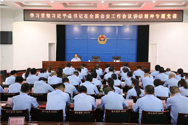 段吉更局长结合分局工作,突出重点、主题鲜明、分析透彻、旁征博引,分别从六方面做了讲述:一、贯彻落实习近平总书记在全国公安工作会议上重要讲话精神首先要在学懂弄通做实上下功夫,准确把握习近平总书记重要讲话精神的丰富内涵和精神实质,坚持不懈用习近平总书记重要讲话精神武装全警头脑。二、贯彻落实习近平总书记在全国公安工作会议上重要讲话精神就是要始终把党的绝对领导作为建警之魂,确保全局工作坚定正确的政治方向做到政治上同向、思想上同心、行动上同步,不折不扣抓好党中央和上级党委各项决策部署的贯彻落实。三、贯彻落实习近平总书记在全国公安工作会议上重要讲话精神就是要始终把履行新时代职责使命当作立警之本,政法战线肩负着维护国家政治安全、确保社会大局稳定、促进社会公平正义、保障人民安居乐业的重大使命任务,是我们公安机关工作的行动指南。四、贯彻落实习近平总书记在全国公安工作会议上重要讲话精神就是要始终把维护公平正义作为从警之基,坚持严格规范公正文明执法,要抓住关键环节,要紧盯容易出现执法问题的重点岗位和环节,要大力提升民警执法能力水平。五、贯彻落实习近平总书记在全国公安工作会议上重要讲话精神就是要始终把改革创新作为强警之路,要健全完善警务管理体系,不断提升警务效能,不断提高人民群众的满意度。六、贯彻落实习近平总书记在全国公安工作会议上重要讲话精神就是要始终把“四个铁一般”标准作为治警之要,按照新时代党的建设总要求,大力加强公安队伍革命化正规化专业化职业化建设,确保队伍有铁一般的理想信念、铁一般的责任担当、铁一般的过硬本领、铁一般的纪律作风。